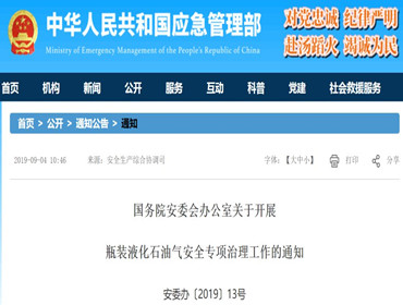 各省、自治区、直辖市及新疆生产建设兵团安全生产委员会:近期,国办督查室在对河北省高碑店市、白沟新城明查暗访时发现,瓶装液化石油气市场管理混乱,非法经营、储存、倒装、运输和违规充装液化石油气问题突出,严重威胁人民群众生命财产安全。国务院领导同志高度重视,作出重要批示,提出明确要求。为切实贯彻落实好国务院领导同志重要批示要求,深入排查治理瓶装液化石油气行业的安全隐患和问题,坚决防范遏制生产安全事故,国务院安委会办公室定于2019年9月至10月开展瓶装液化石油气安全专项治理工作。现将有关事项通知如下:
